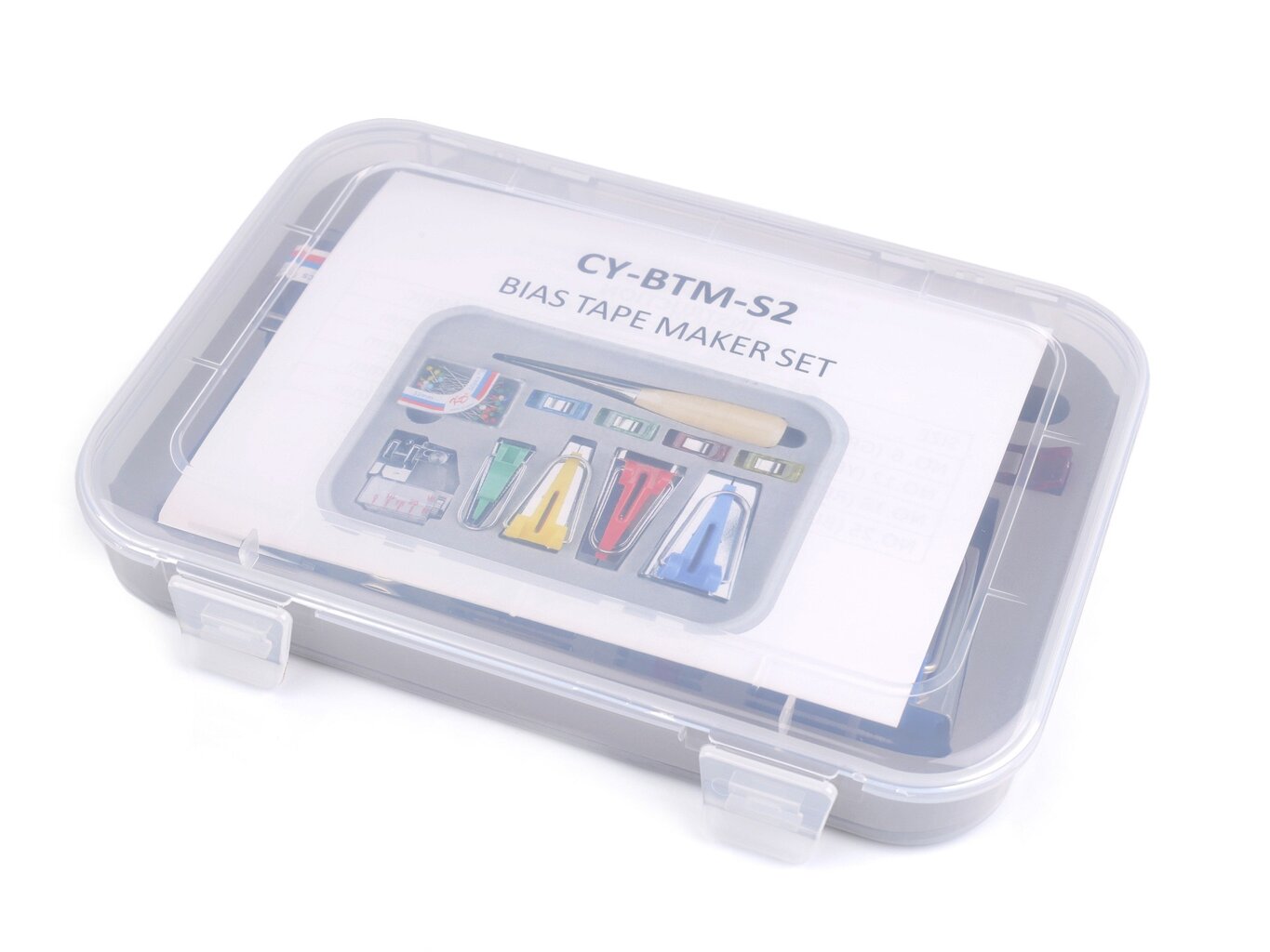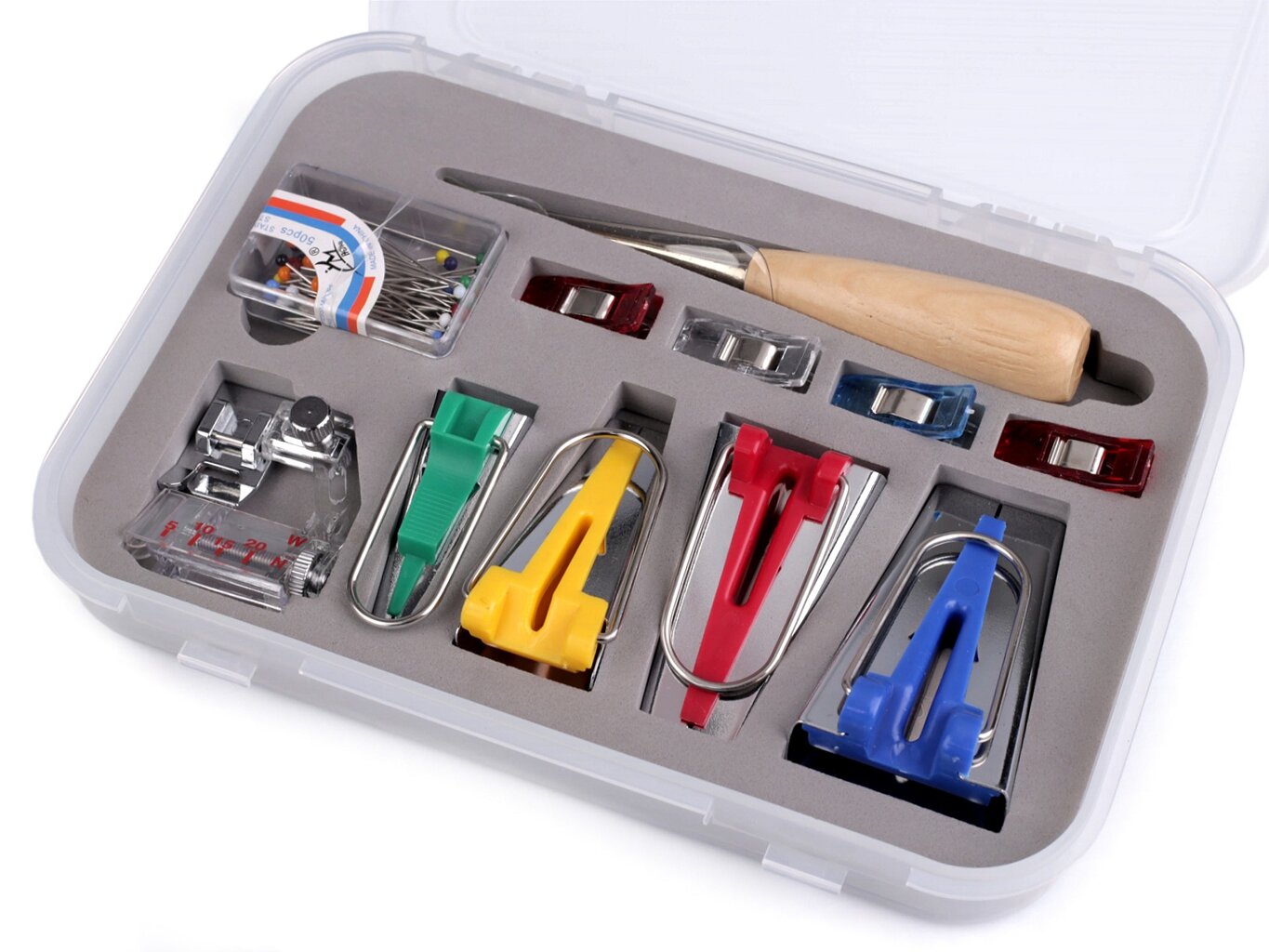 Set náradia na zakladanie šikmých prúžkov je pkratické príslušenstvo, ktoré využijete pri zakladaní šikmých prúžkov. Sada je uložená v priehľadnom plastovom boxe.