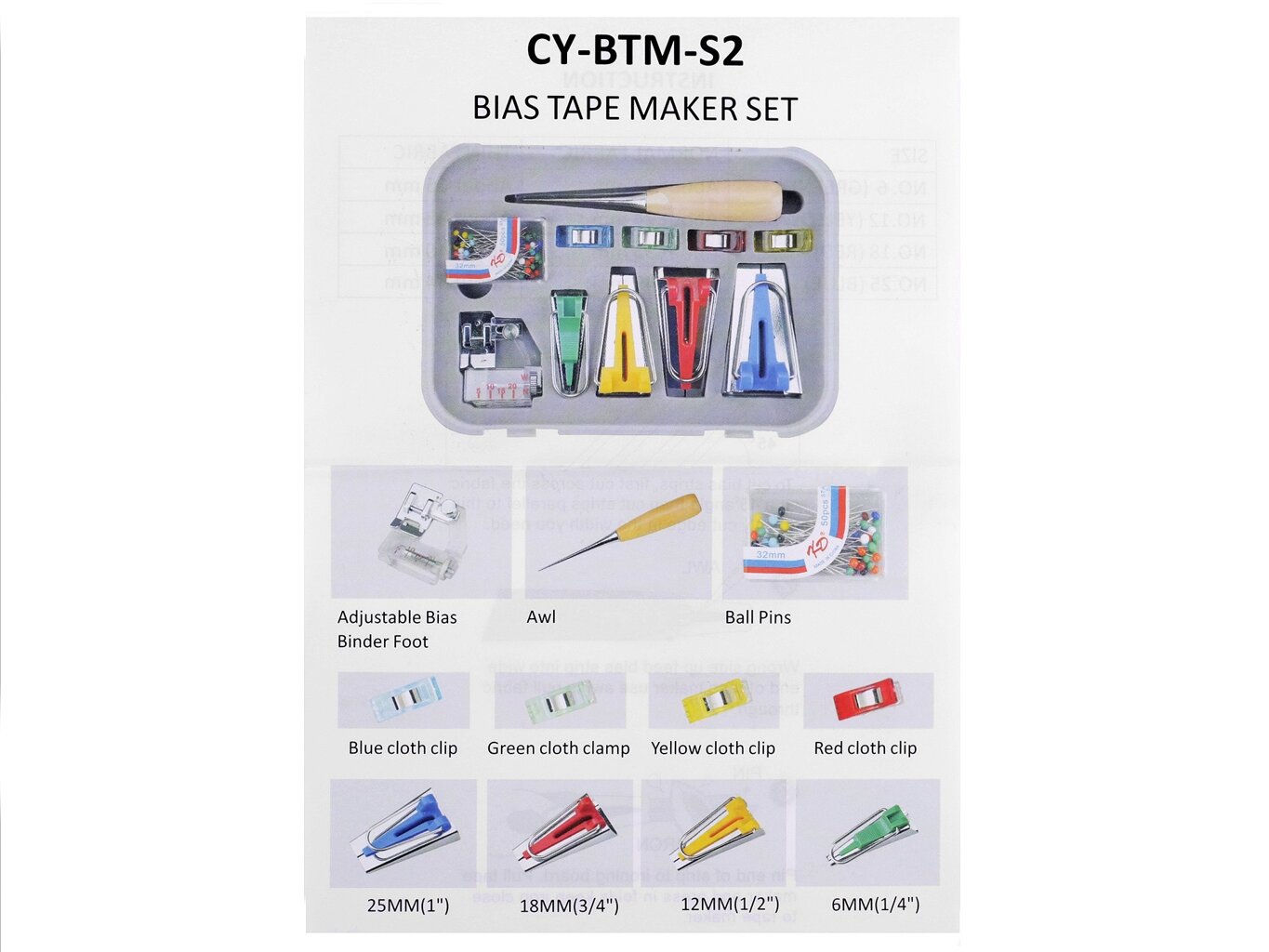 - zakladače šikmých prúžkov so šírkou 6 mm, 12 mm, 18 mm, 25 mm