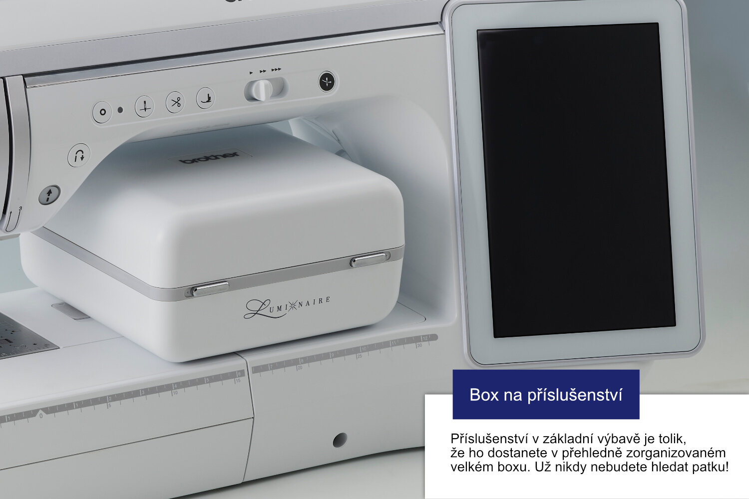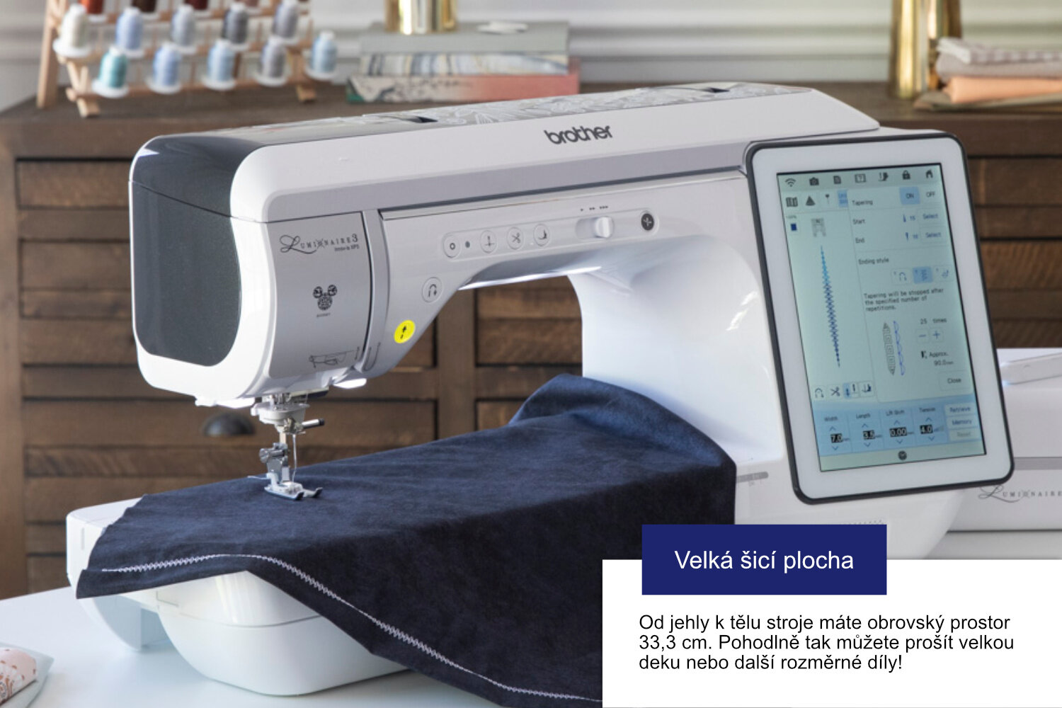 obchod@raj-sitia.skŠicí a vyšívací stroj Brother Luminaire XP3 je nejnovější a nejmodernější šicí a vyšívací stroj značky Brother, který Vám umožní rozvinout Váš talent. Stroj je vylepšenou variantou šicího a vyšívacího stroje Brother Luminaire XP1. Představujeme Vám ten nejmodernější šicí a vyšívací stroj Brother všech dob. Stroj je vybavený technologií StitchVision, která vám pomocí inovativního projektoru umožní ušít perfektně každý steh. Chcete být nadčasový? S tímto strojem budete, protože jeho světelná projekce šití, vyšívání i quiltování posouvá technologii o několik světelných let dopředu. Vaše projekty budou nyní jednodušší, rychlejší a přesnější. Nyní můžete přímo skenovat vlastní vzory a během několika sekund stroj převede vaše motivy do vzoru pro vyšívací stroj. Vaše dovednosti se s tímto strojem neskutečně znásobí. Vše ovládáte naprosto přirozeně na barevném dotykovém displeji s vysokým rozlišením velikosti 10 palců. Technologie ovládání prstem jako má tablet vám vše neuvěřitelně usnadní. Stroj má navíc několik nových funkcí jako je přenos vzorů z počítače pomocí Wifi, mobilní aplikace Artspira, aplikace My Stitch Monitor, aplikace My Design Snap, funkce My Connection.