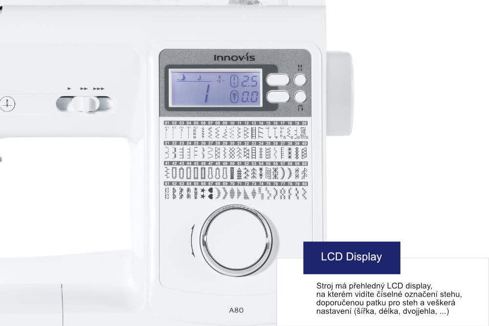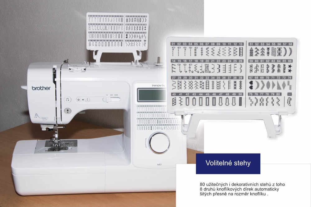 Důležité vlastnosti: Šicí stroj Brother Innov-Is 80 jevybavený volným ramenem, 80 programy s automatickým šitím 7 druhy knoflíkových dírek a s možností kombinovat až 35 různých druhů stehů k tvorbě vlastních vyšívacích vzorů. Šicí stroje Brother Innov-Is A80 jsou dále vybaveny řadou užitečných funkcí např. automatické navíjení spodní nitě, navlékač jehly, volba polohy jehly, regulace délky i šířky stehu a jiné. Šicí stroj Brother Innov-Is A80 umožňuje sledování šicích parametrů pomocí LCD displeje či snadné ovládání pomocí elektronického voliče a tlačítek na ovládacím panelu.