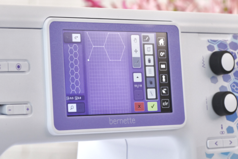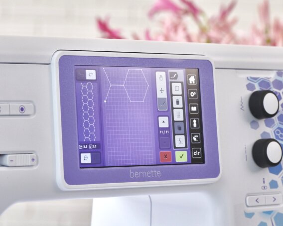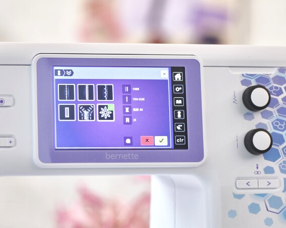 Dôležité vlastnosti: Šijací a vyšívací stroj Bernette b79 disponuje 500 šijacími programami, 17 typmi gombíkovej dierky, 276 vyšívacími vzormi, 7 typmi abecedy, dotykovým farebným LCD displejom a maximálnou vyšívacou plochou 260 x 160 mm. Bernette b79 sú vybavené veľkou farebnou dotykovou obrazovkou, ktorá umožňuje napr. navolenie a úpravu stehu, zrkadlenie výšiviek, otáčanie, zmenu veľkosti, umiestňovanie, Word ART atď. Vyšívací stroj je kompatibilný s príslušenstvom BERNINA CutWork a vie automaticky rozpoznať veľkosť nasadeného rámčeka. Pracovná plocha stroja od ihly doprava je 23 cm a je osvetlená 4 LED svetlami. Stroj ďalej disponuje regulovateľnou rýchlosťou šitia, nastaviteľným prítlakom pätky a napätím hornej nite na obrazovke, polohovaním ihly hore/dole, tlačidlom Štart/Stop pre šitie bez pedála a ďalšími funkciami. V základnej výbave stroja nájdete aj programy BERNINA ToolBox Lettering a Editing.