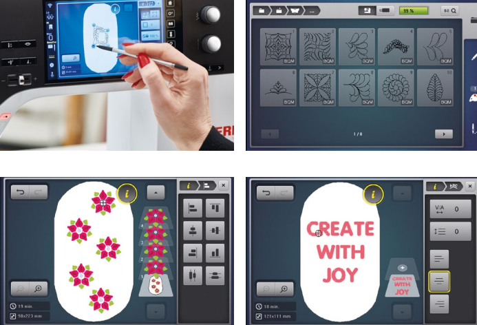 Vyšívanie na stroji Bernina 790 PRE Vás prenesie do sveta profesionálov. Priamo na obrazovke môžete vzory upravovať a kombinovať. Možnosť tvoriť zakrivené nápisy, meniť hustotu stehov a kombinovať ozdobné stehy s výšivkovými vzormi alebo vytvárať nádherné nekonečné výšivkové vzory, Vás posunie vo vyšívaní v domácich podmienkach o ďalší level. Môžete zmeniť poradie vyšívania zložitých vzorov podľa farieb, prípadne pred vyšitím použiť voľby alternatívnych farieb.