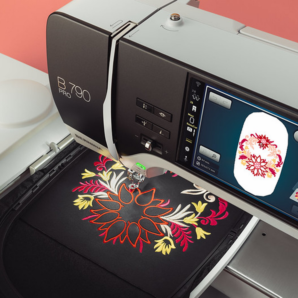 Vyšívanie na stroji Bernina 790 PRE Vás prenesie do sveta profesionálov. Priamo na obrazovke môžete vzory upravovať a kombinovať. Možnosť tvoriť zakrivené nápisy, meniť hustotu stehov a kombinovať ozdobné stehy s výšivkovými vzormi alebo vytvárať nádherné nekonečné výšivkové vzory, Vás posunie vo vyšívaní v domácich podmienkach o ďalší level. Môžete zmeniť poradie vyšívania zložitých vzorov podľa farieb, prípadne pred vyšitím použiť voľby alternatívnych farieb.