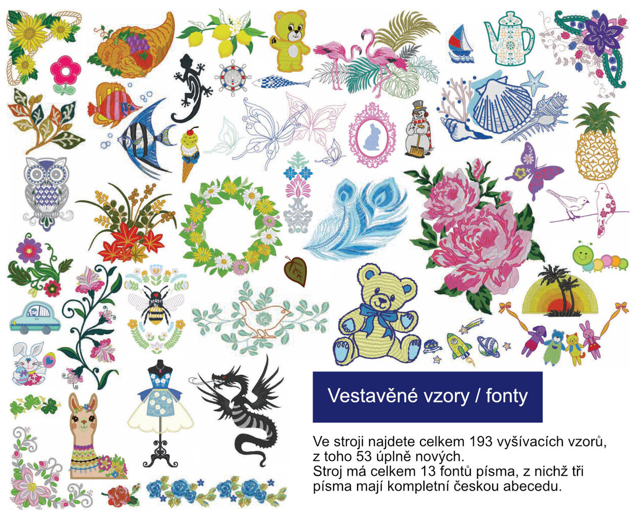 - 193 vyšívacích vzorov vrátane 13 fontov písma a 2 druhy monogramov (pri troch fontoch písma kompletná česká vyšívacia abeceda)