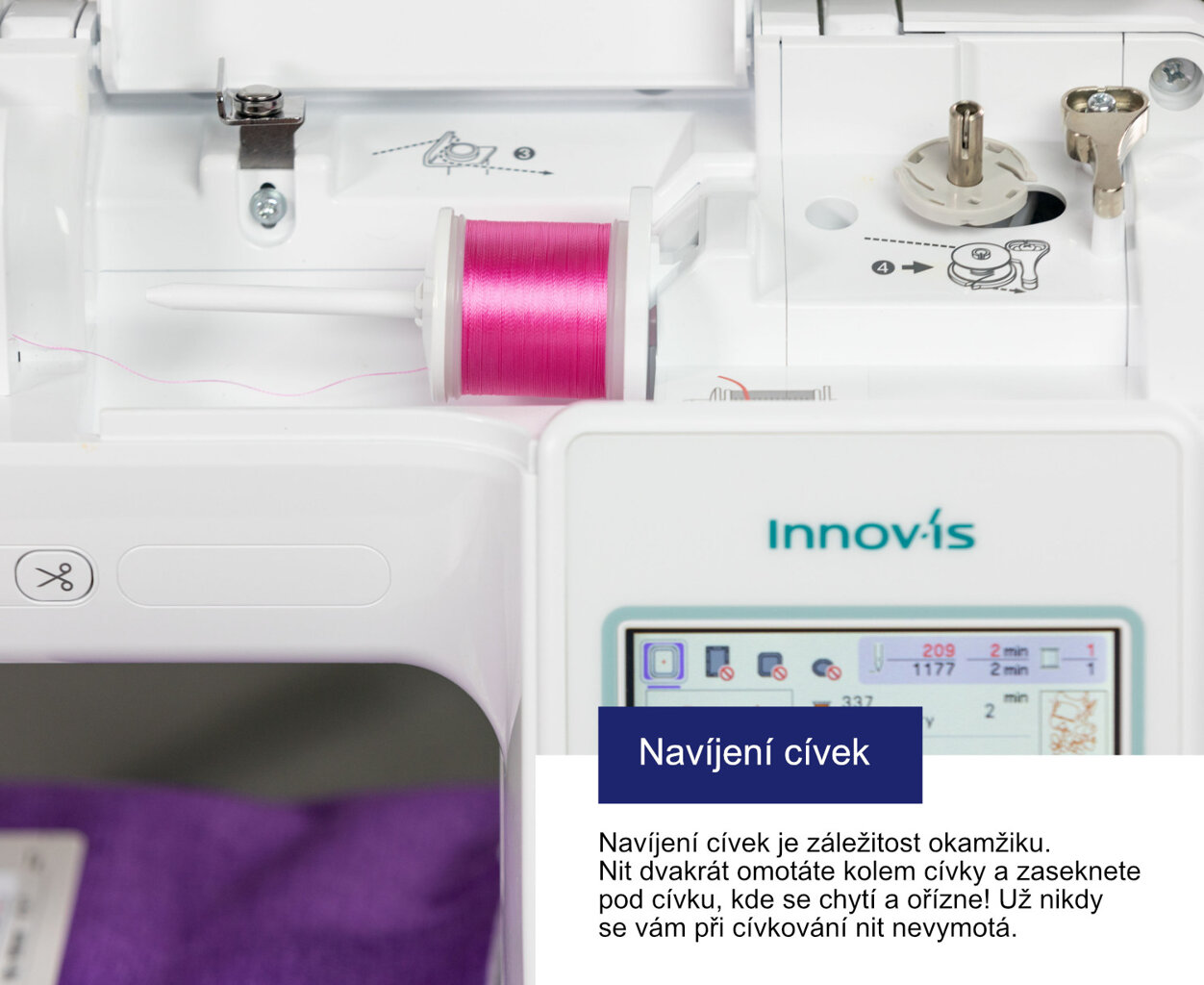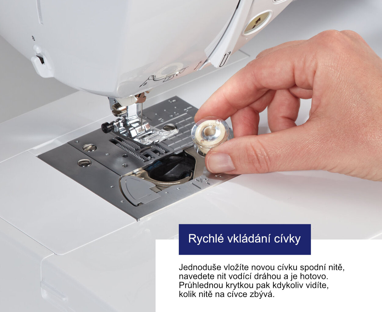 - Stroj má komfortné navliekanie nite, kedy na navlečenie nite do ihly pomocou navliekača vám stačí jeden prst!