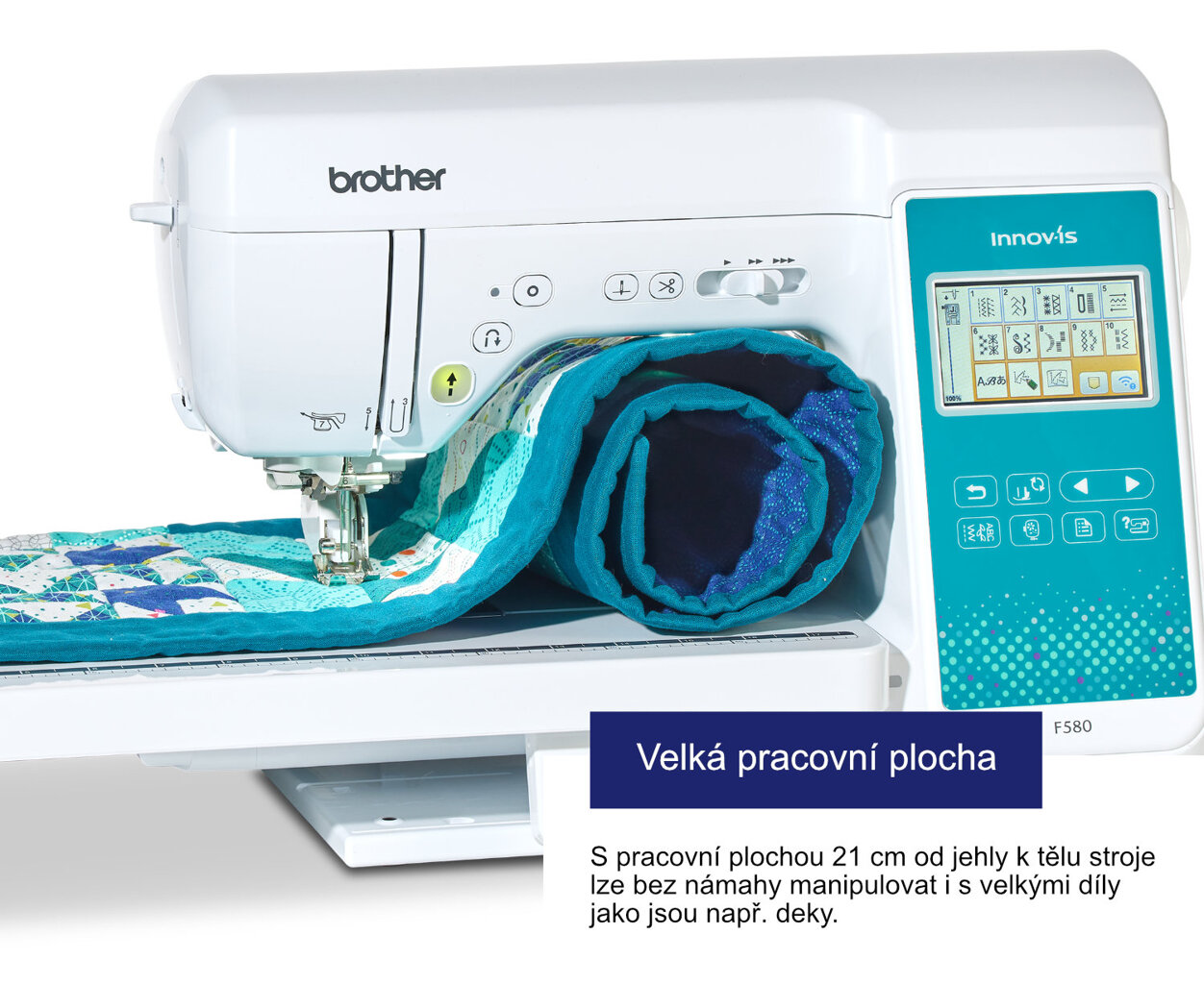 obchod@raj-sitia.skŠijací a vyšívací stroj Brother Innov-IS F580 je novinkou medzi elektronickými kombináciami šijacích a vyšívacích strojov pre domácnosť. Tento šijací a vyšívací stroj sa môže pochváliť predovšetkým menu v českom jazyku a tiež ponukou písma s českou diakritikou. Stroj je vybavený plne automatickým navliekačom nití, veľkou pracovnou plochou a veľkým dotykovým displejom, ktorý je v češtine. Pri funkcii vyšívania má stroj pri troch fontoch písma ponuku abecedy pre vyšívanie v slovenčine, nebudete tak už postrádať písmenko Š ani Ž. V repertoári má široký sortiment šijacích aj vyšívacích stehov a vzorov, navyše s možnosťou tvorby vlastného stehu. Vďaka veľkej pracovnej ploche a kolennej páke, ktorou je tento model tiež vybavený, budete mať úplné pohodlie pri patchworkovom šití a quiltovaní. Je to veľmi všestranný stroj, s ktorým môžete šiť, vyšívať aj quiltovať. Je vhodný ako pre patchwork, tak pre šitie odevov alebo vyšívanie !