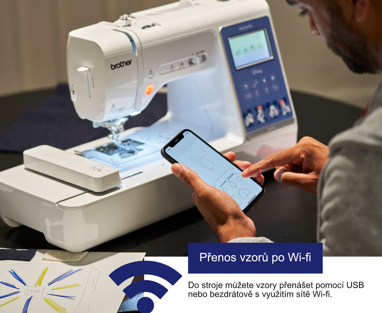 Vyšívacie funkcie: máte k dispozícii 200 vyšívacích vzorov vrátane 65 vzorov DISNEY + 11 druhov fontov abecedy + 140 druhov orámovania výšiviek. Nájdete tu mnoho kvetinových vzorov, ozdobných monogramov, vzorov s témami sviatkov, ozdobné rámy a detské motívy, quiltovacie vzory + VZORY DISNEY. Stroj ponúka možnosť nahrávania vzorov pre vyšívanie cez USB flash disk alebo bezdrôtovo pomocou Wi-fi.