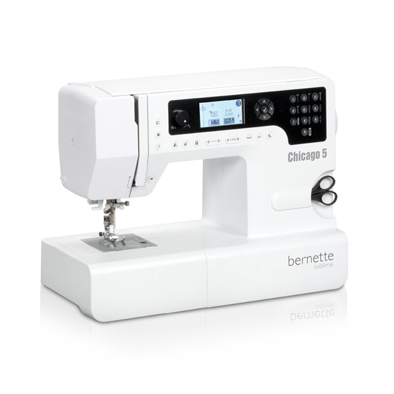 Dôležité vlastnosti: Šijací stroj Bernette Chicago 5 obsahuje 210 druhov stehov vr. 2 typov abecedy a 8 typov automatickej gombíkovej dierky šité na 1 krok. V stroji je použitý horizontálny rotačný chapač s priehľadnou krytkou s vkladaním cievky zhora. Pamäť stroja umožňuje uloženie až 4 x 20 stehov a obsahuje 100 dekoratívnych vzorov. Samozrejmosťou sú všetky bežné elektronické funkcie, napr. tlačidlo štart/stop na šitie bez pedála, možnosť regulácie rýchlosti šitia na stroji, polohovanie ihly hore/dole, tlačidlo na zapošitie a ďalšie.