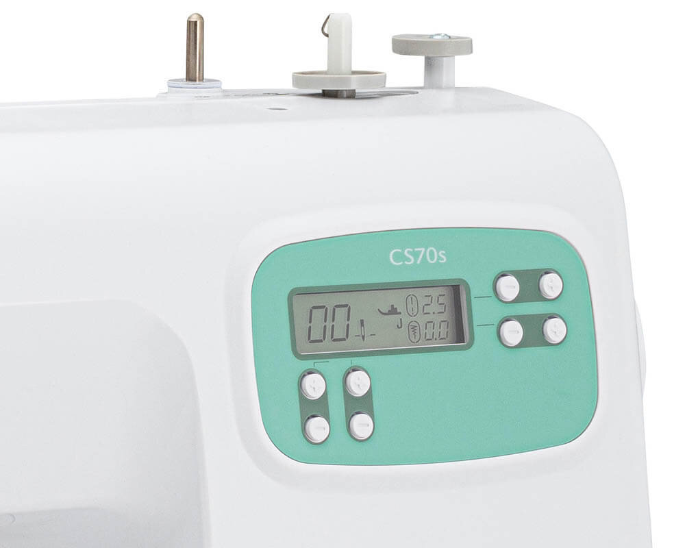 Elektronický šijací stroj Brother CS 70 S má horizontálny rotačný chapač, voľné rameno, LCD displej, 70 šijacích programov, 7 druhov automatickej gombíkovej dierky. CS 70 S s jednoduchým ovládaním ocenia aj začiatočníci.
