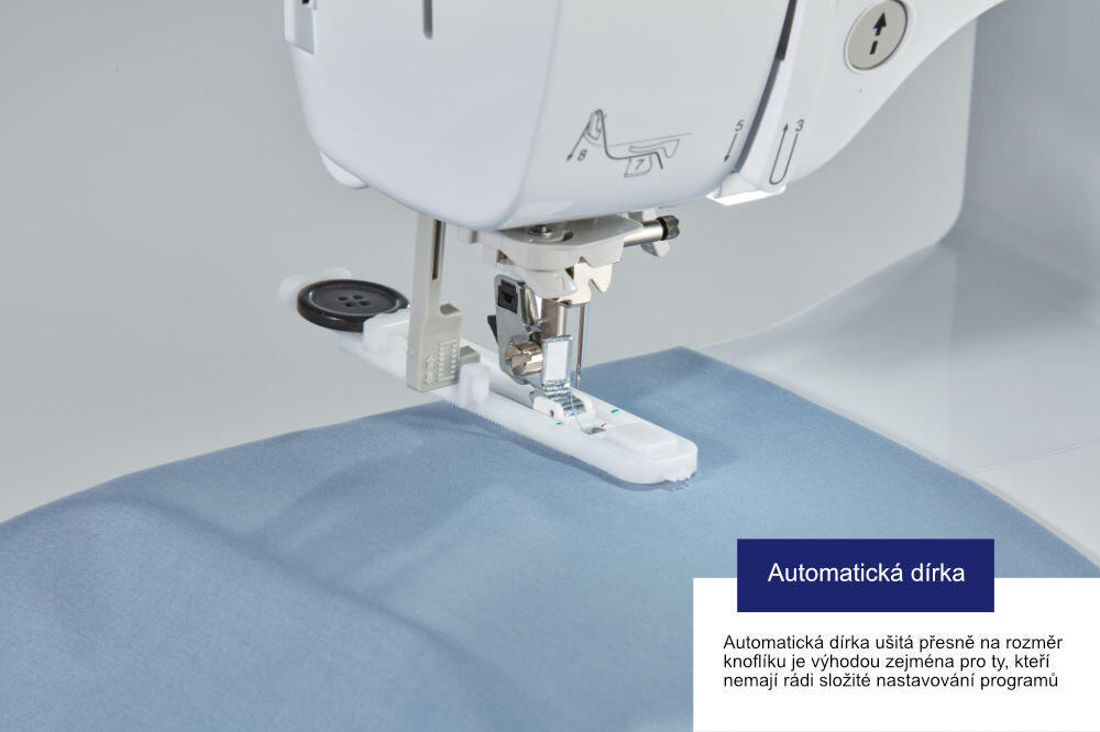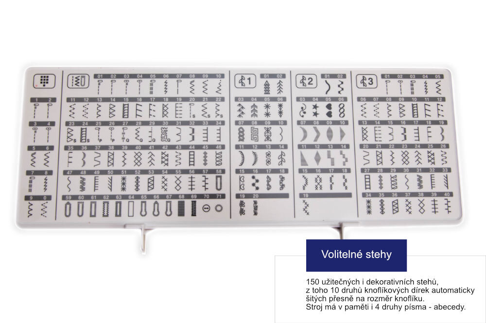 - 150 programov , 9 typov automatickej gombíkovej dierky na 1 krok, 3 typy abecedy