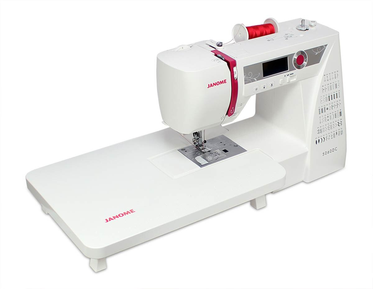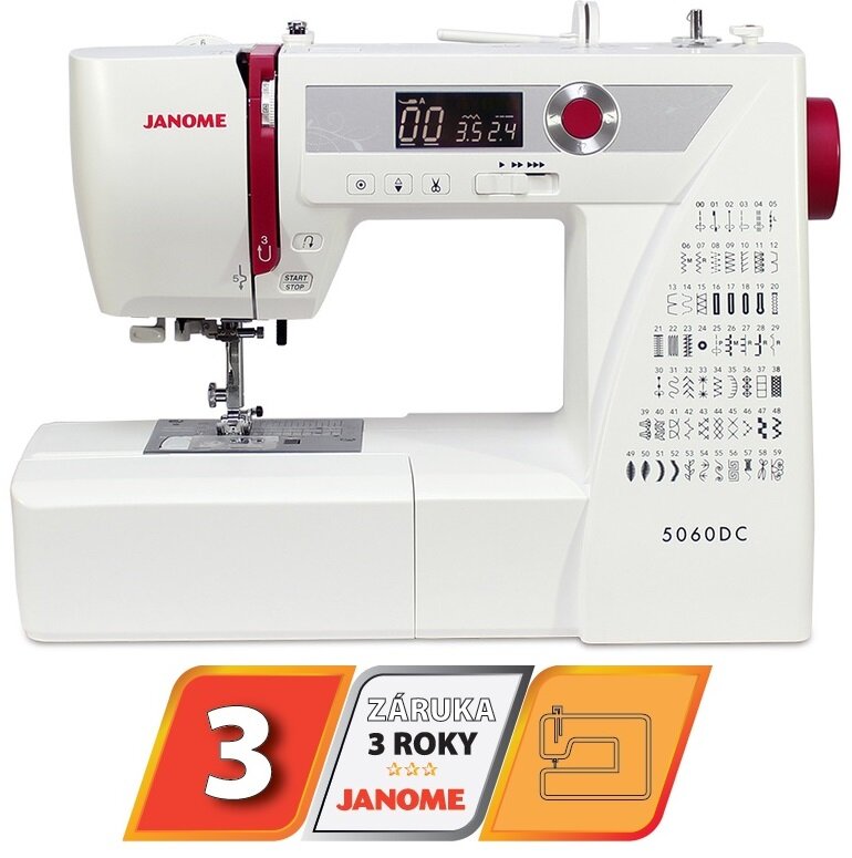 Dôležité vlastnosti : Šijací stroj Janome DC 5060 má horizontálny rotačný chapač s priehľadnou krytkou umožňuje sledovanie množstva navinutej nite na cievke. Stroj má veľkoplošné podávacie zúbky SFS čo je sedemnásobne delený podávač so špeciálne tvarovanými zubami, ktorý zaisťuje plynulé podávanie všetkých druhov látok, pravidelné stehy a šírky cik-caku až 7 mm. Voľné rameno slúži na pohodlné šitie uzavretých tvarov. Okrem už spomínaného nájdete u tohto stroja aj obľúbené elektronické funkcie typu tlačidlo štart/stop na šitie bez pedálu, možnosť polohovania ihly hore a dole, regulátor rýchlosti šitia na stroji a tlačidlo na zapošitie. Funkcia automatického odstrihu nite umožňuje jediným tlačidlom odstrihnúť spodnú aj hornú niť. V cene stroja prídavný stolík rozširujúci pracovnú plochu.