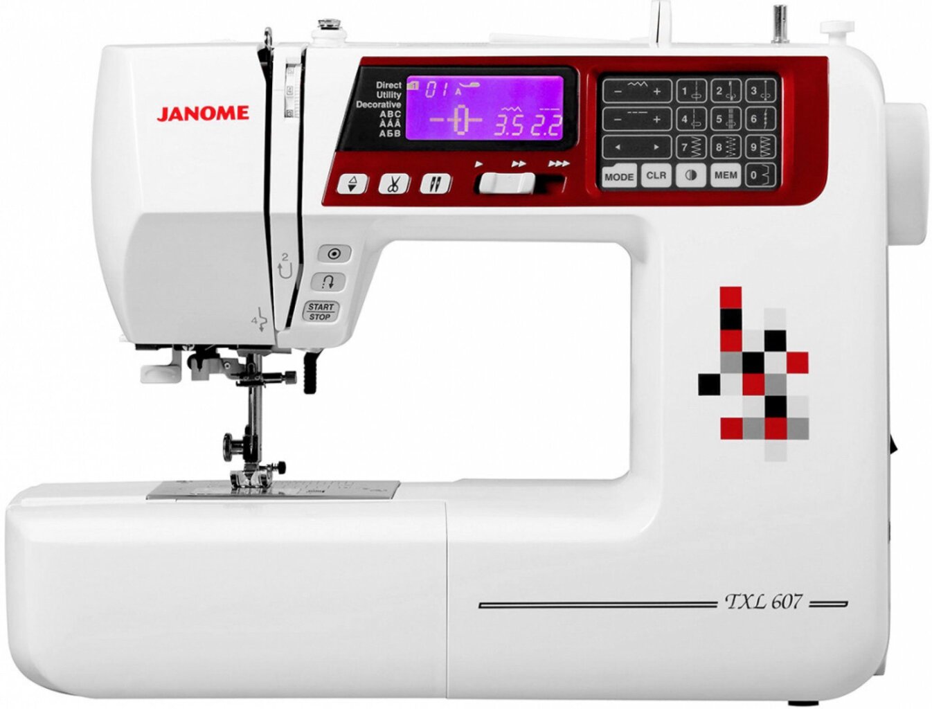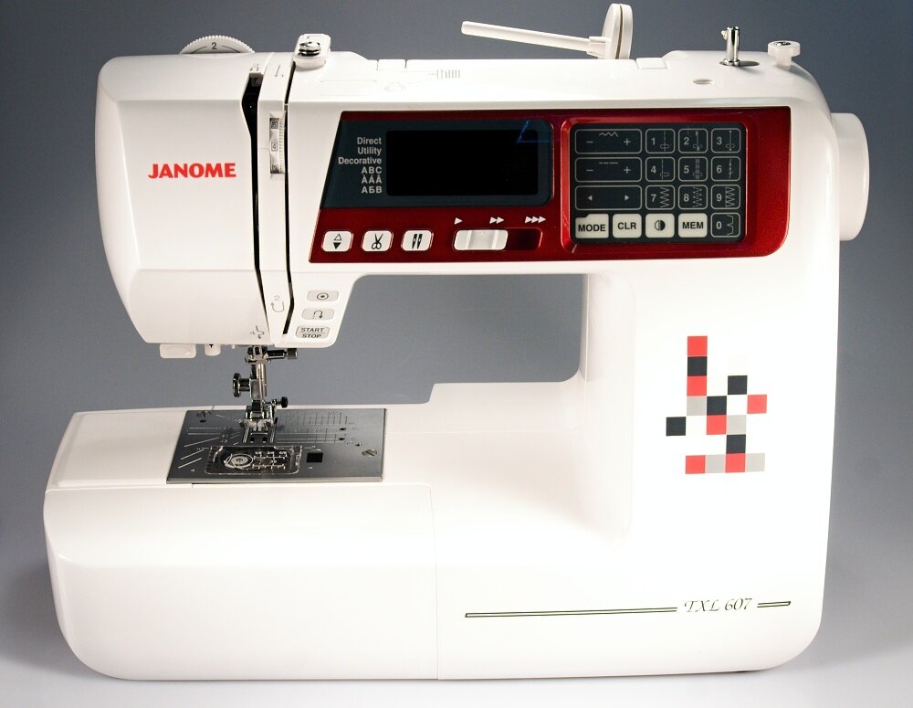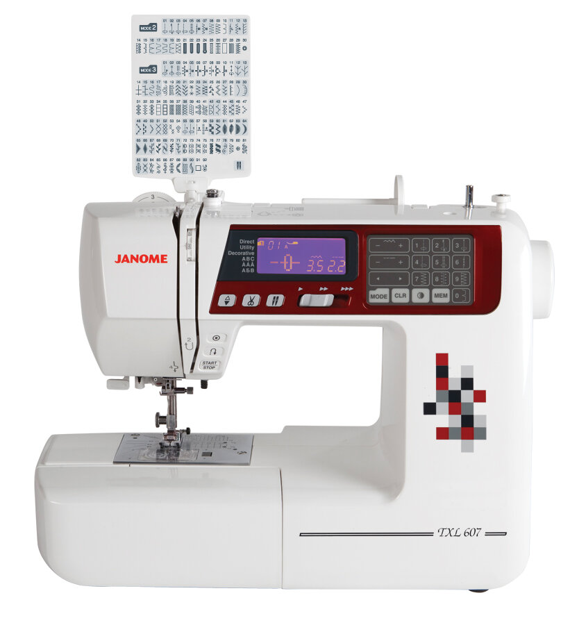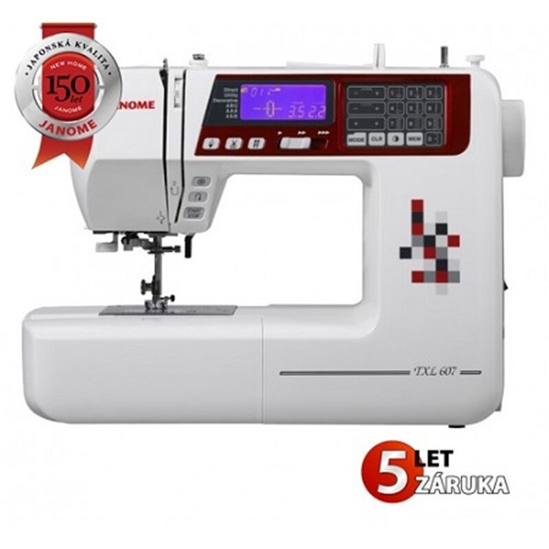 Dôležité vlastnosti: Šijací stroj Janome 607 TXL má 225 šijacích programov a šije stehy základné, elastické (strečové), overlockové, plastické vyšívacie a špeciálne stehy určené na quiltovanie a patchwork. Šijací stroj má horizontálny rotačný chapač s priehľadným krytom, ktorý umožňuje kontrolu množstva návinu nite na spodnej cievke kedykoľvek počas šitia. Šijací stroj umožňuje manuálne nastavenie prítlaku pätky, automatické nastavenie dĺžky a šírky stehu s možnosťou dodatočnej úpravy, šitie dvojihlou či jednoduchú a rýchlu výmenu šijacích pätiek. Šijací stroj má automatický odstrih nite, automatickú senzorovú gombíkovú dierku, SFS podávací systém so sedemnásobne deleným podávačom a špeciálne tvarovanými zubami. Vyšívanie písmen vr. európskych znakov.