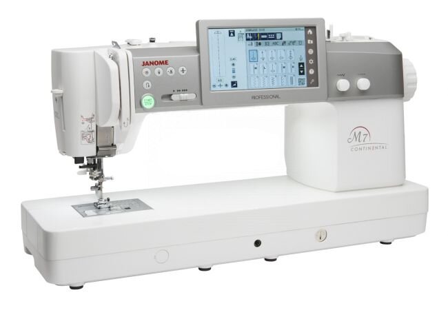 Dôležité vlastnosti: Šijací stroj Janome COntinental M7 Professional má 400 typy stehov, 13 typy gombíkovej dierky, 8 typy abecedy, šírkou cik-caku až 9 mm, farebným dotykovým 7" displejom a rýchlosťou šitia až 1300 stehov za minútu.