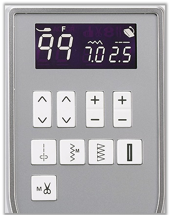 - Podsvietený LED displej - zobrazuje číslo zvoleného stehu a nastavenú šírku aj dĺžku stehu, vhodnú pätku
