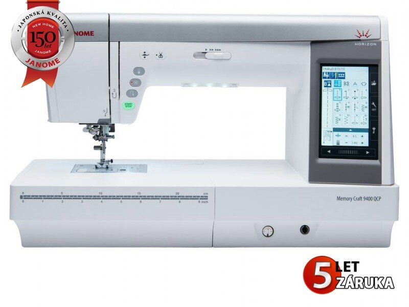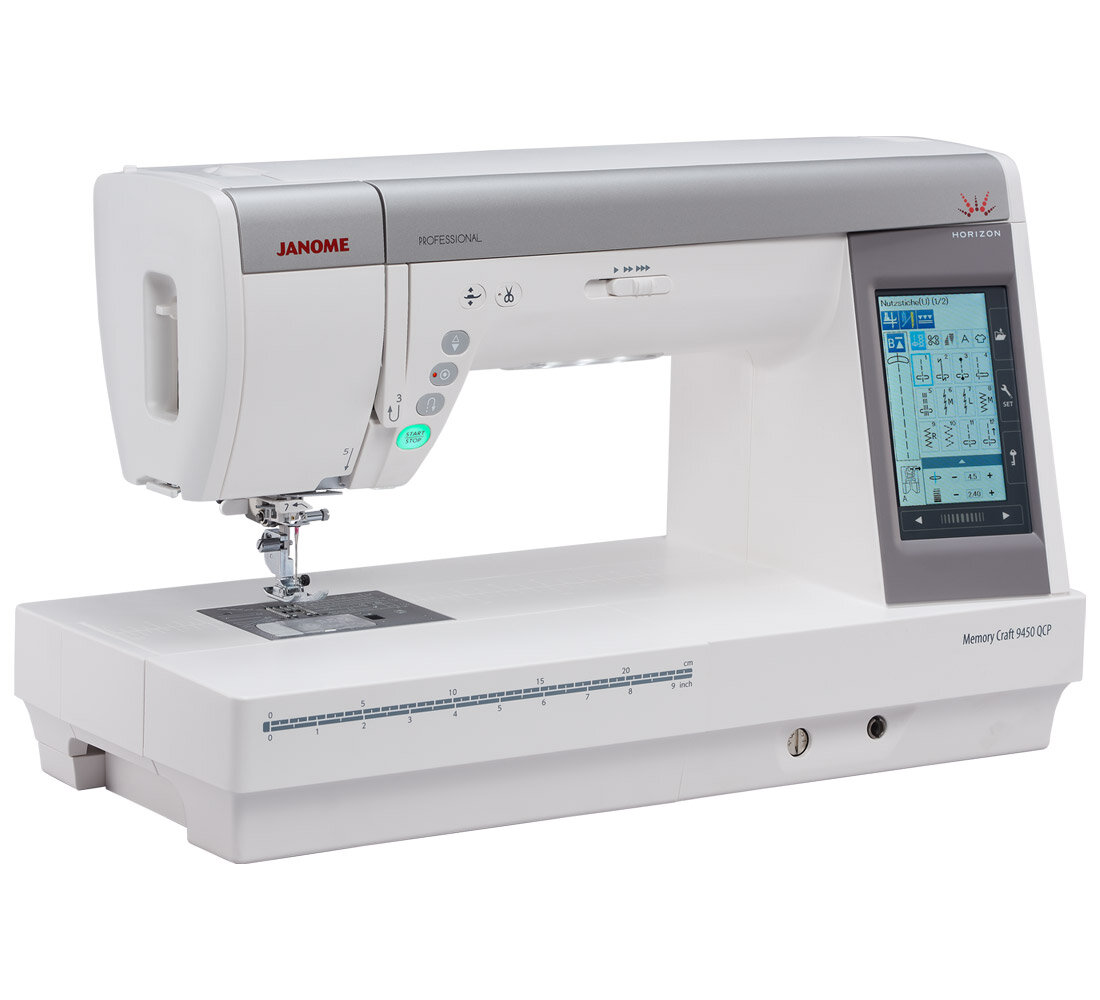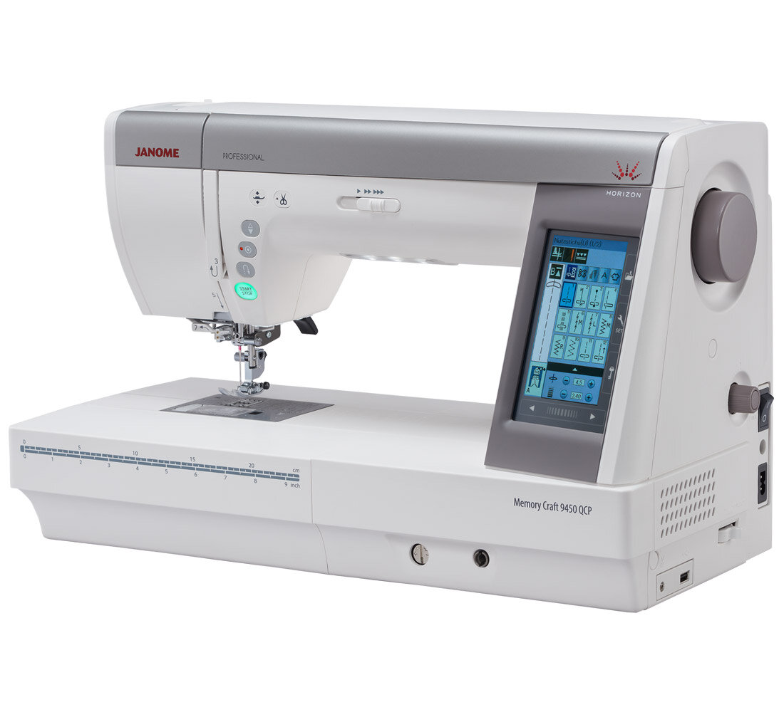 Šijací stroj Janome Horizon MC 9450 QCP je elektronický šijací a quiltovací stroj s dotykovým LCD displejom a systémom horného podávania AcuFeedTM Flex. Tento robustný šijací stroj má 350 šijacích programov vr. vyšívanie monogramov, horizontálne