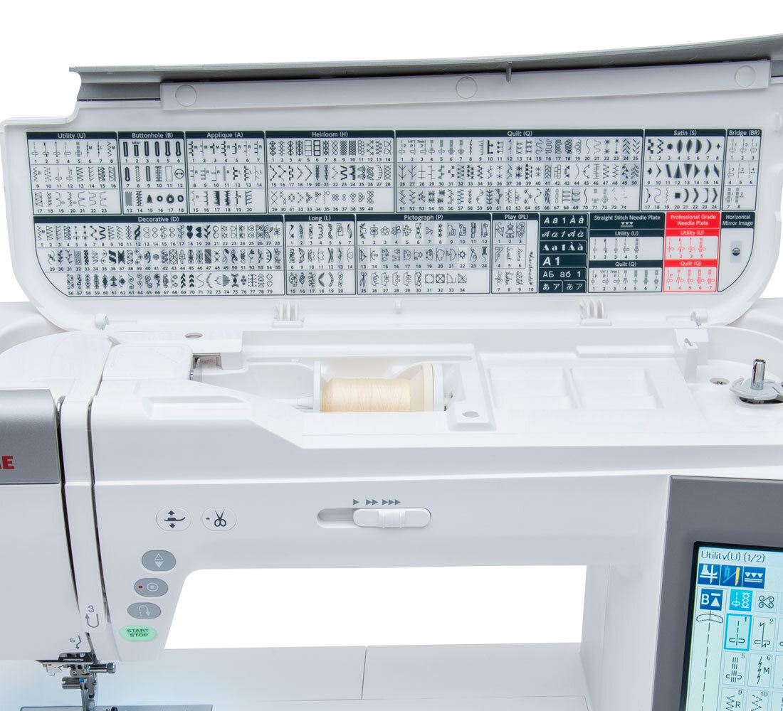 - Přehledný dotykový LCD displej zobrazující zvolený steh, vhodnou patku, délku i šířku stehu apod.
