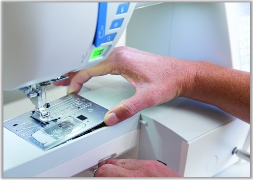 - Možnosť zasunutia podávacích zúbkov pre ľahké látanie či šitie voľným pohybom