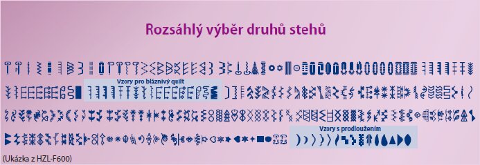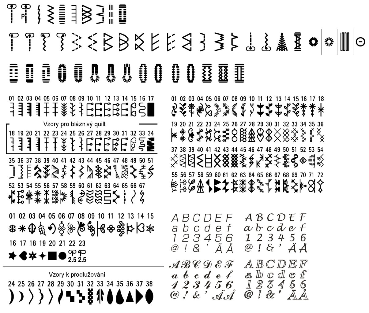 - 225 druhov stehov vr. pružných, overlockových, širokej škály dekoračných stehov a náhodných quiltovacích stehov