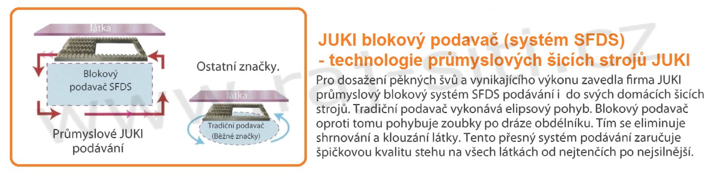 Šijací stroj Juki HZL - DX7 je nový špičkový elektronický šijací a quiltovací stroj pre domácnosť s priemyselným systémom podávania látky. Vybavený 287 druhmi stehov vr. 4 typov písma a funkcií vznášania pätky.