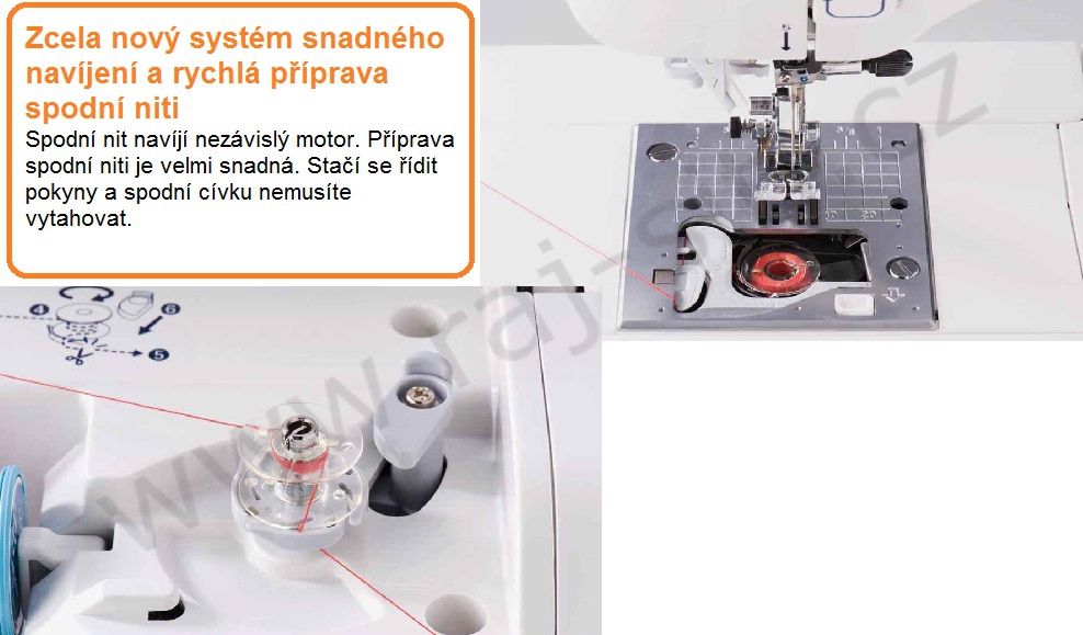 - Vlastný motor pre nezávislé cievkovanie spodnej nite s aretáciou konca nite (bez omotávania a kĺzania nite okolo cievky)