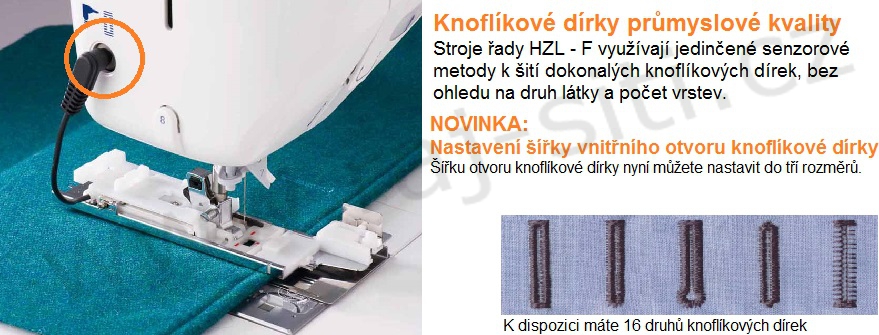 - Senzorové šitie dokonalých gombíkových dierok s nastavením šírky otvoru (3 druhy šírky otvoru)