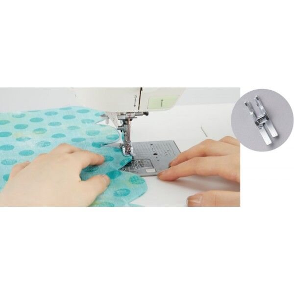 - Voľné quiltovanie a šitie podľa pravítka - nakoľko je možné zasunúť podávač priamo z obrazovky stroja, je prepnutie na voľné quiltovanie veľmi jednoduché. Priehľadná quiltovacia pätka kompatibilná s pravítkom, ktorá je v základnej výbave stroja, značne rozšíri Vaše quiltovacie možnosti.