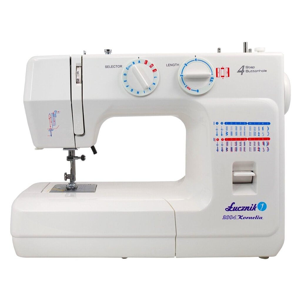 Šijací stroj Lucznik 2004 Kornelia II je multifunkčný viacúčelový šijací stroj do domácnosti, ktorý má 28 šijacích programov, voľné rameno, celokovový kyvný CB chapač. Šijací stroj má kovové časti.