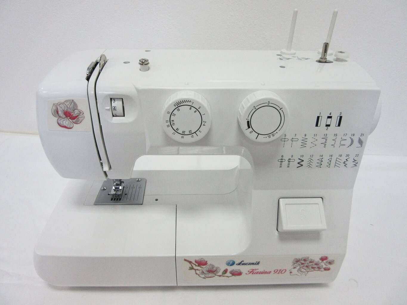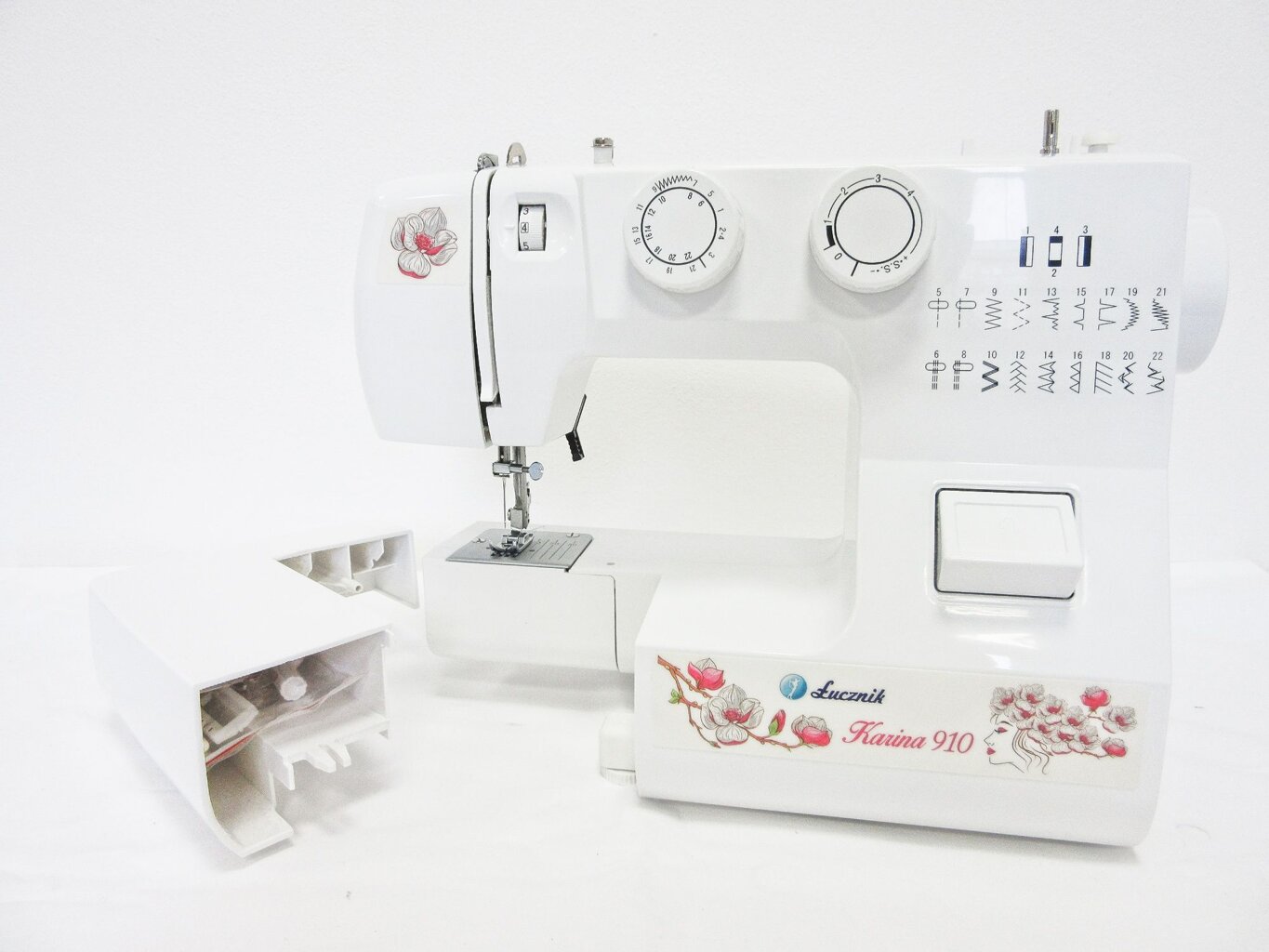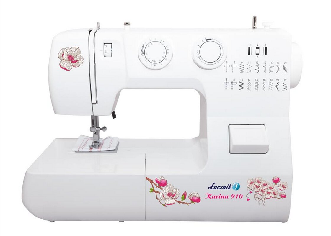 Šijací stroj Lucznik 910 Karina je mechanický domáci stroj, ktorý je vybavený 22 šijacími programami vr. overlockových stehov, kyvným CB chapačom, voľným ramenom, 4-krokovou gombíkovou dierkou aj regulovateľnou dĺžkou stehu.