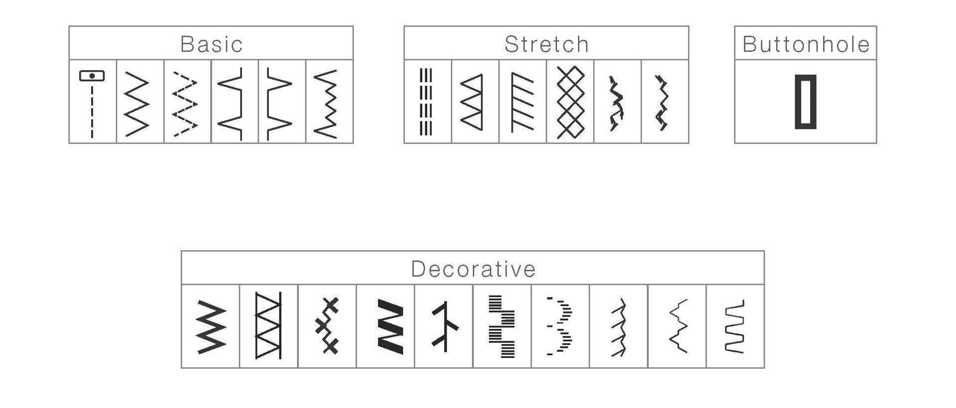 - 23 druhov stehov (6 základných, 11 dekoratívnych, 5 pružných plus 1-kroková gombíková dierka)
