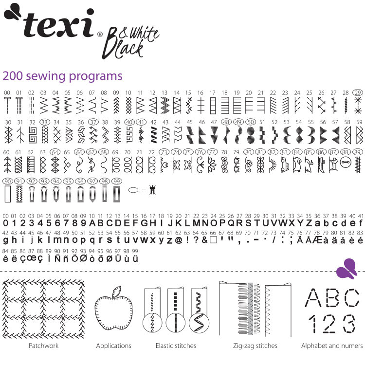 Šijací stroj Texi Black and White je elektronický šijací stroj s LCD displejom a prehľadným ovládacím panelom. Šijací stroj Texi Black and White ponúka 200 typov stehov, horizontálny rotačný chapač, 9 typov automatickej gombíkovej dierky.