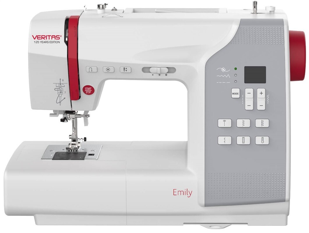 Šijací stroj Veritas Emily je elektronický šijací stroj pre domácnosť vybavený 80 programami, 3 typy gombíkovej dierky šité jedným krokom, horizontálnym rotačným chapačom, regulovateľnou dĺžkou a šírkou stehu a voľným ramenom.