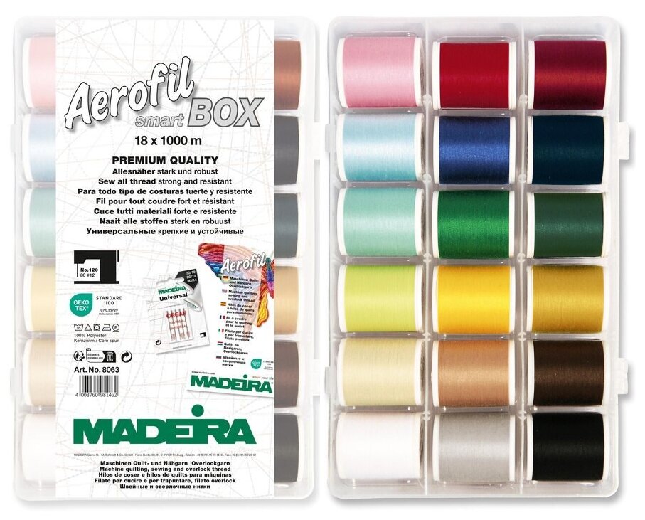 Šijacia niť Madeira Aerofil 120 Smartbox (18 x 1000 m) je prenosný plastový box, ktorý obsahuje 18 ks polyesterových šijacích nití. 120 v návine 1000 ma univerzálne ihly.