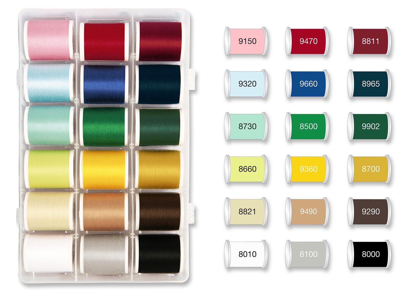 Praktický prenosný box, ktorý obsahuje 18 ks kvalitných šijacích nití Aerofil č.120 v návine 1000 ma sadu univerzálnych ihiel. Box ďalej obsahuje tlačenú farebnicu. Box je vyrobený z pevného priehľadného plastu.