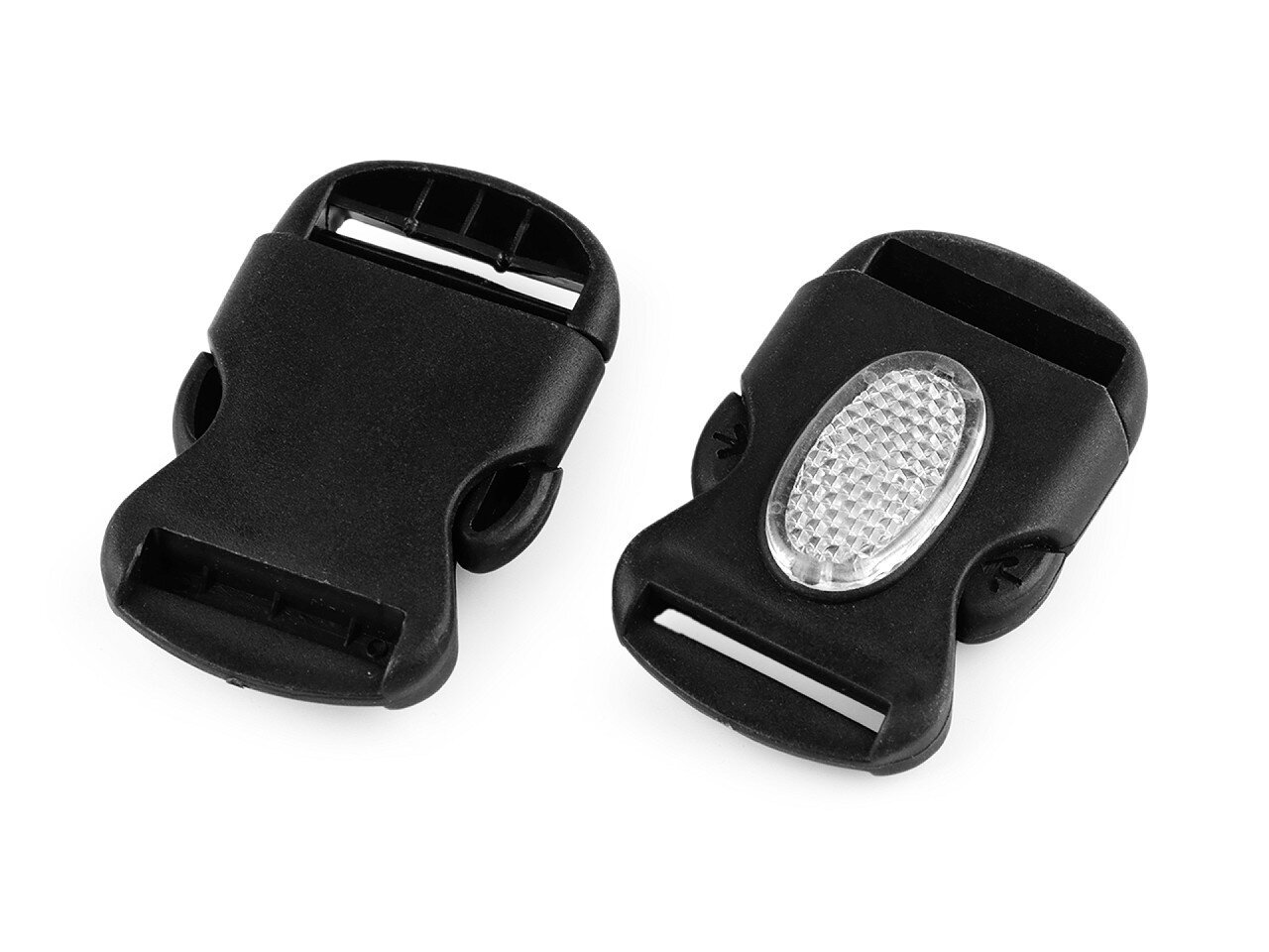 Plastový spona s odrazkou pro lepší viditelnost za šera, deště či tmy. Spona je vhodná k výrobě ledvinkových opasků, brašen, batohů a podobně. Využít ji můžete také jako zapínání pracovních lacláčů, montérek.