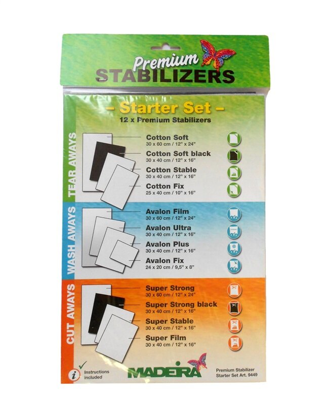 Štartovací balíček podkladových materiálov Madeira je veľmi praktická sada 12 druhov podkladových materiálov pre strojové vyšívanie. V balení nájdete odtrhávacie, vodou rozpustné aj odstrihávacie vliselíny.