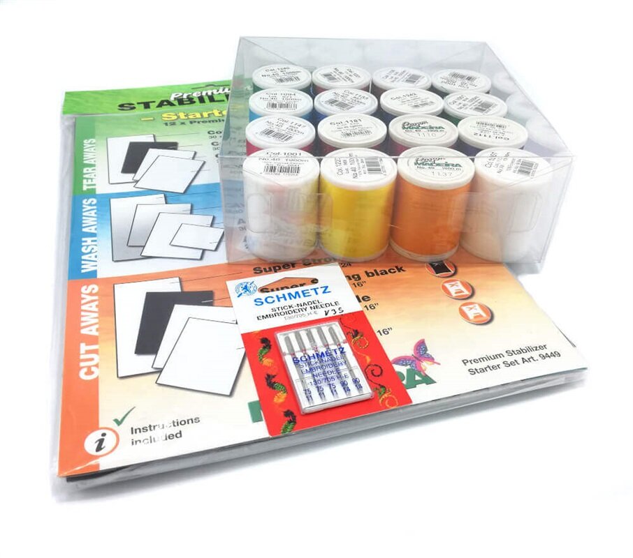 Štartovací set pre vyšívanie Madeira je praktické balenie 15ks vyšívacích nití, bielej spodnej nite, základného balíčka podkladových materiálov a ihiel pre vyšívacie stroje.