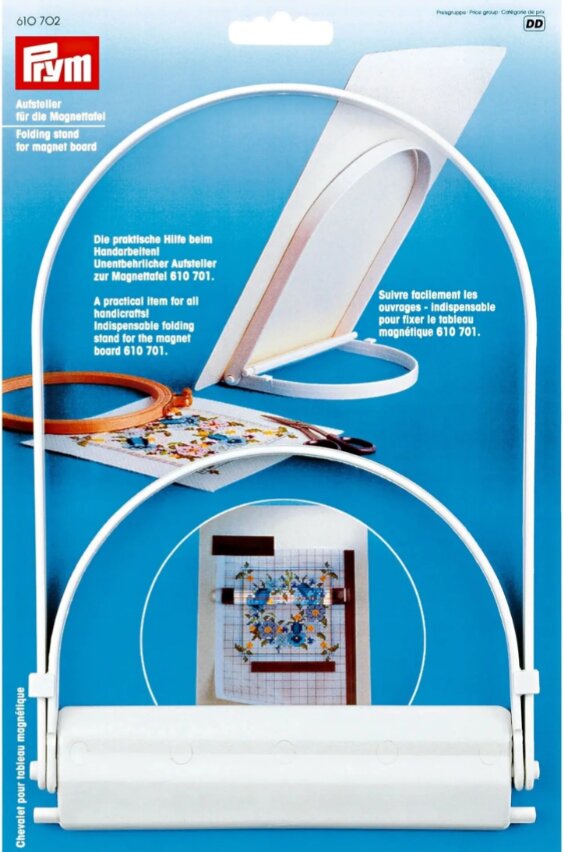 Stojan pre magnetickú tabuľu pre prehľadnú fixáciu vyšívacích vzorov a jednoduché naznačenie postupu práce. Variabilný a skladací stojan od značky Prym.