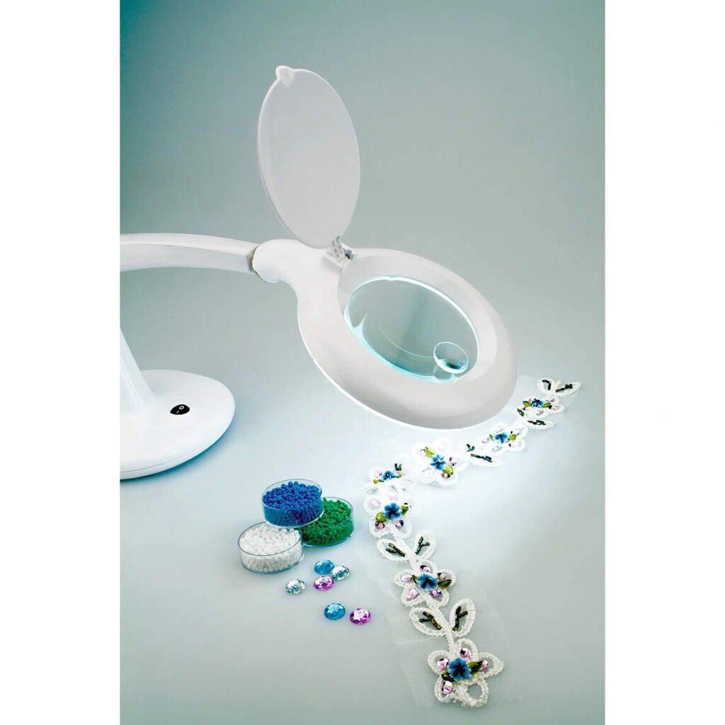 Stolní lampa s lupou LED - PRYM je praktická stolní lupa s osvětlením, která má dvojnásobné zvětšení a integrovaný přídavný objektiv se čtyřnásobným zvětšením. Stojan má pevnou základnu a několik kloubů pro nastavení polohy.