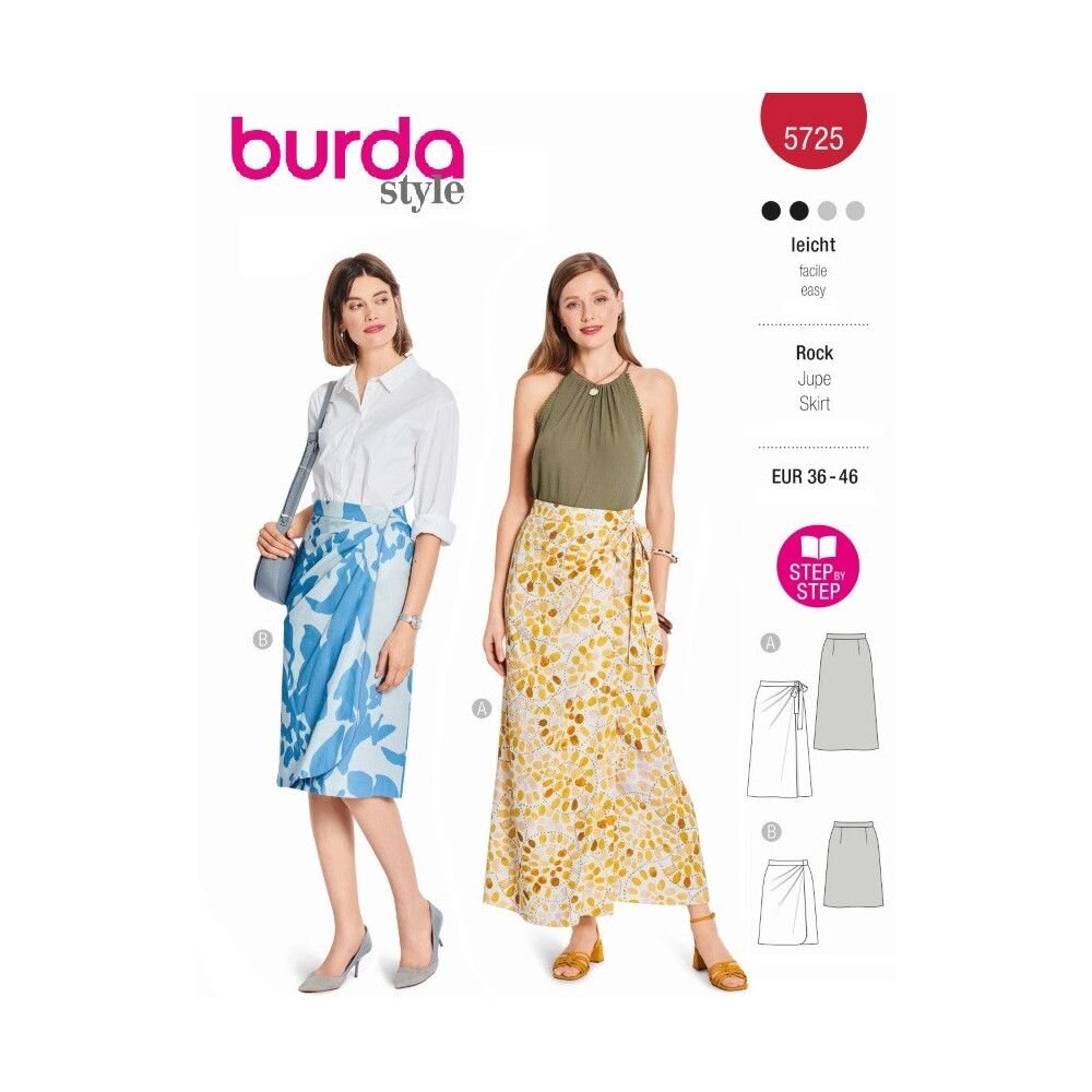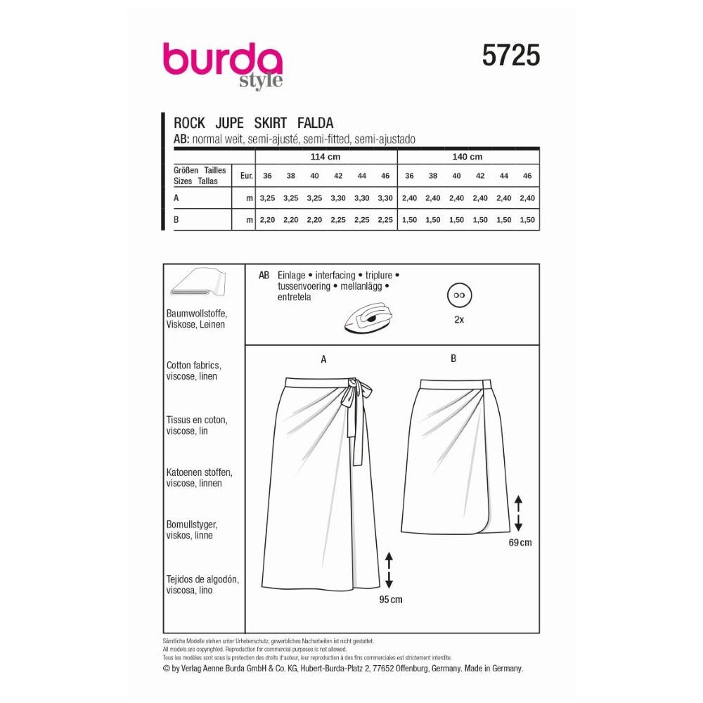 obchod@raj-sitia.skStrih Burda červený 5725 - zavinovacia sukňa, sukňa so skladmi je súbor strihov na ušitie pohodlnej dámskej sukne. Strihy sú vytlačené na kvalitnom kriedovom papieri. Vďaka jednoduchému strihu, podľa ktorého zvládnu šiť aj začiatočníci, získate originálne modely pre Váš šatník.