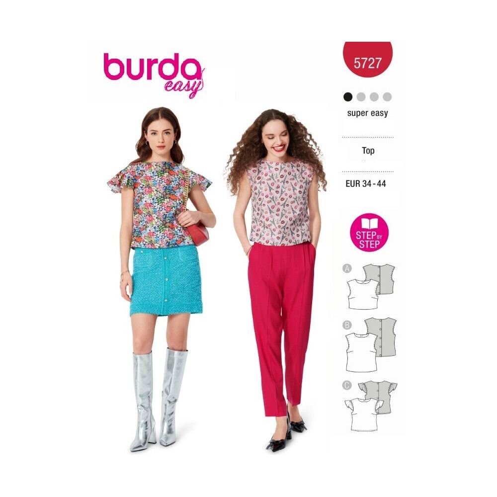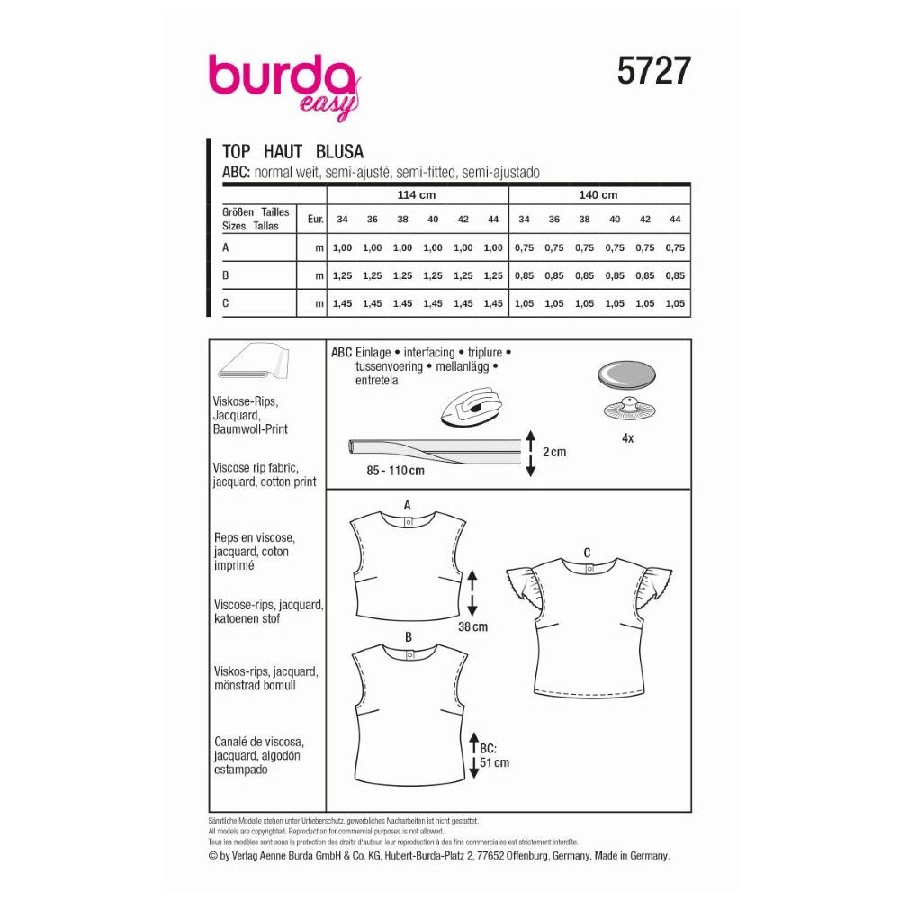 obchod@raj-sitia.skStrih Burda červený 5727 - blúzka s prepínaním na chrbte, top bez rukávov, crop top je súbor strihov na ušitie pohodlnej dámskej blúzky. Strihy sú vytlačené na kvalitnom kriedovom papieri. Vďaka jednoduchému strihu, podľa ktorého zvládnu šiť aj začiatočníci, získate originálne modely pre Váš šatník.