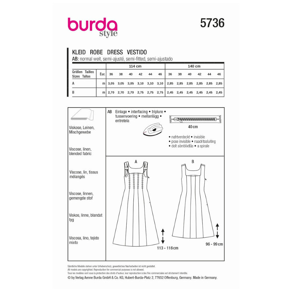 obchod@raj-sitia.skStrih Burda červený 5736 - šaty na ramienka, šaty s rozšírenou sukňou, ľanové šaty je súbor strihov na ušitie štýlových šiat. Strihy sú vytlačené na kvalitnom kriedovom papieri. Vďaka jednoduchému strihu, podľa ktorého zvládnu šiť aj začiatočníci, získate originálne modely pre Váš šatník.