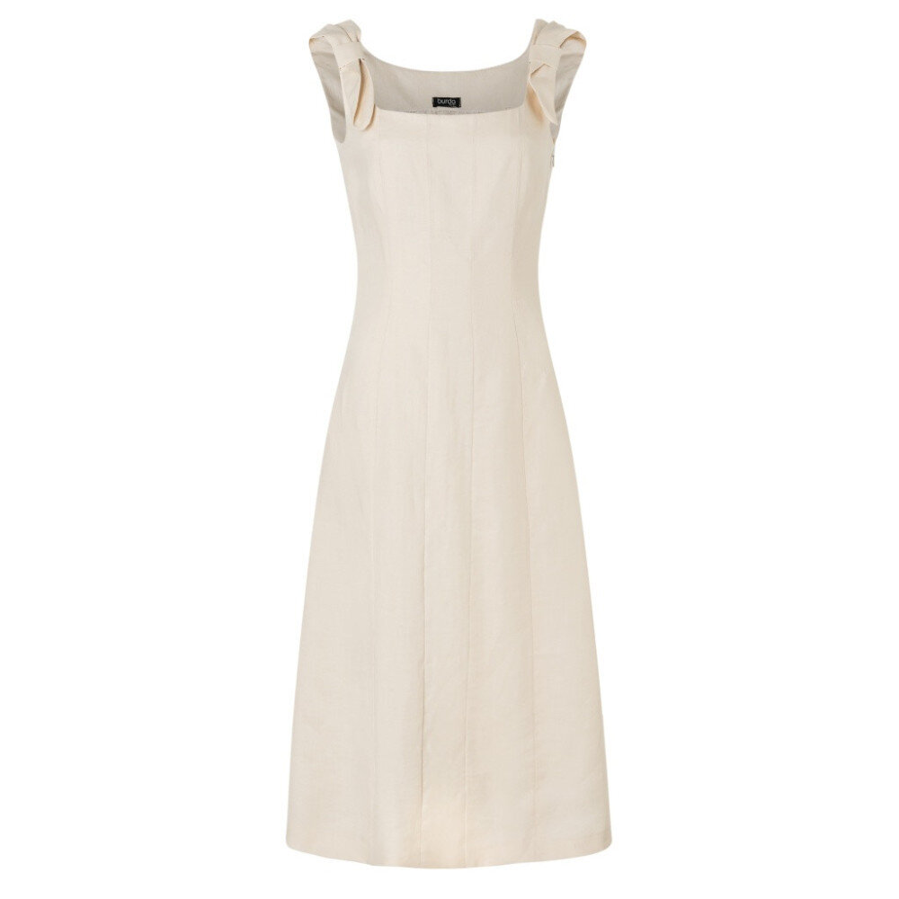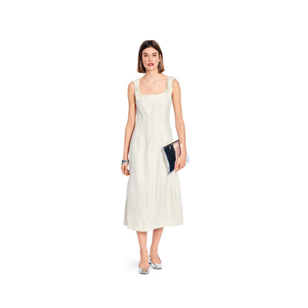 Strih Burda červený 5736 - šaty na ramienka, šaty s rozšírenou sukňou, ľanové šaty je súbor jednoduchých strihov na ušitie štýlových šiat.