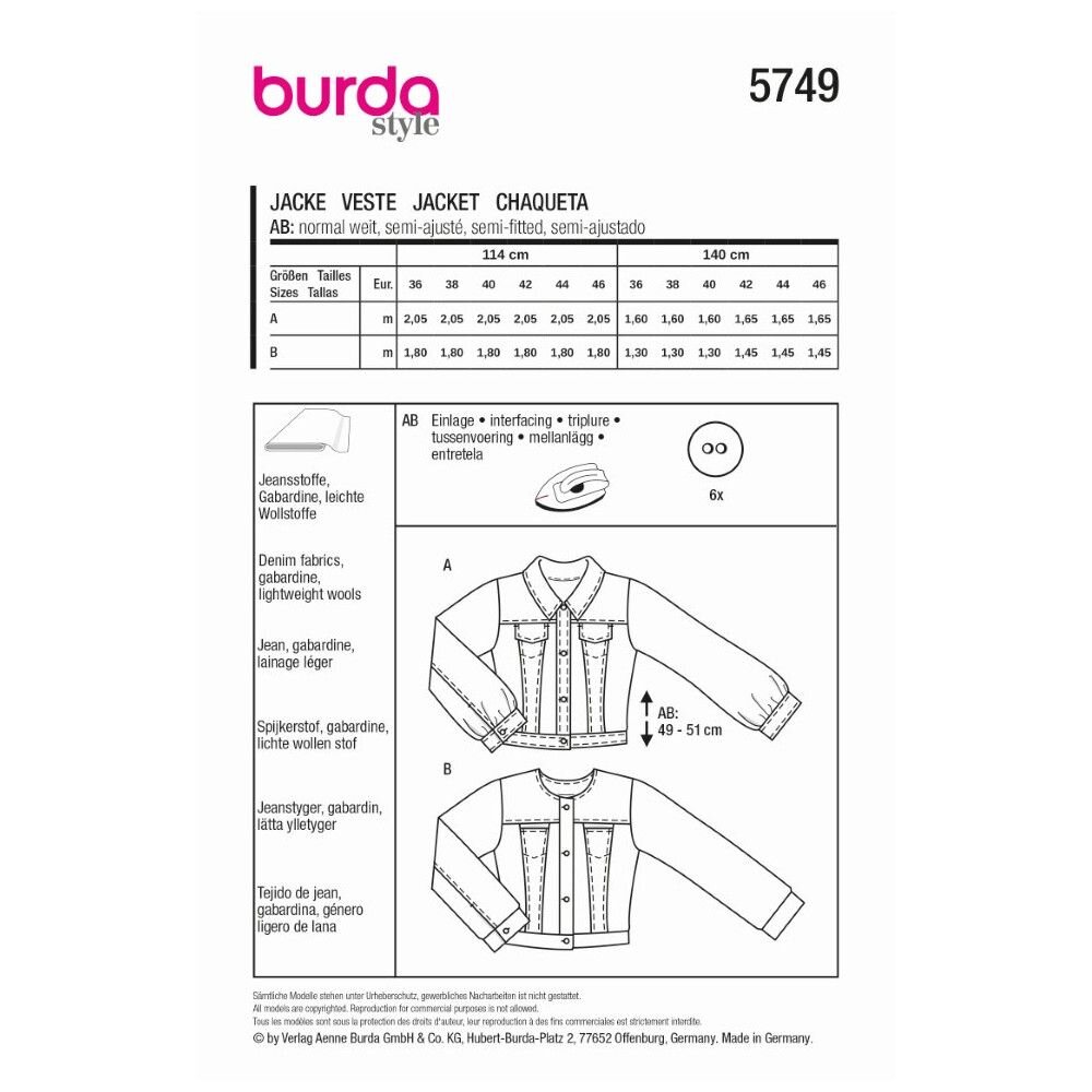 obchod@raj-sitia.skStrih Burda červený 5749 - džínsová bunda, kabátik sako je súbor strihov na ušitie štýlovej džínsovej bundy a saka. Strihy sú vytlačené na kvalitnom kriedovom papieri.
