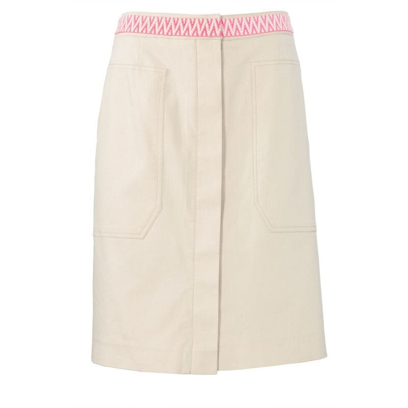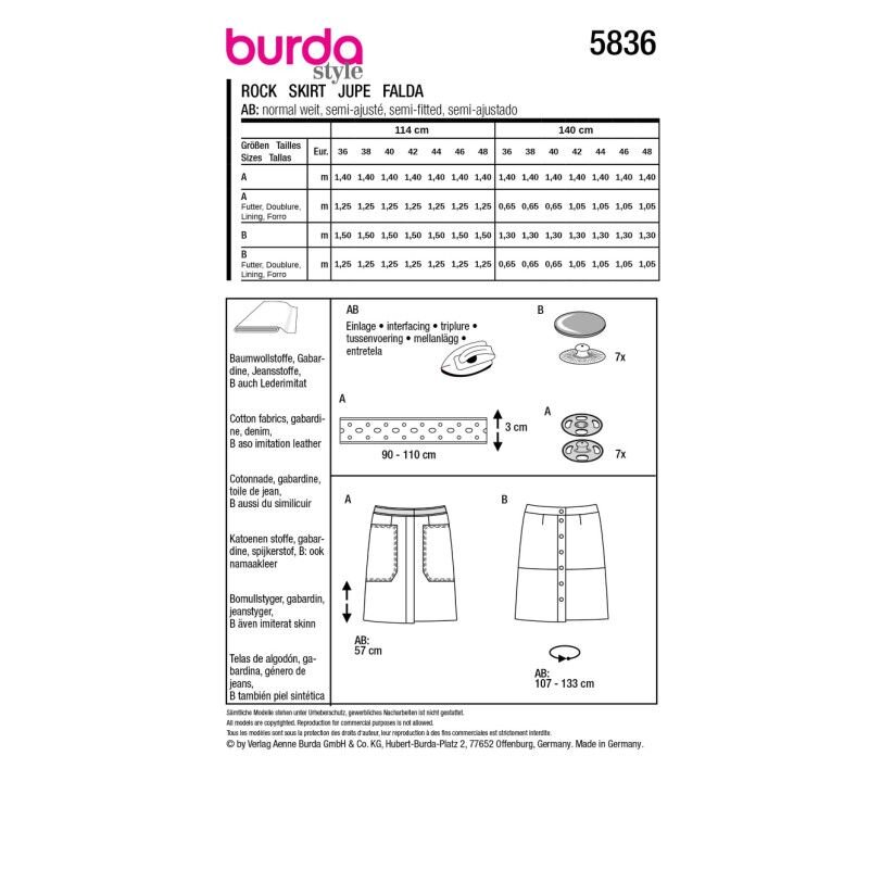 Strih Burda červený 5836 - džínsová, zapínacia, koženková sukňa je súbor strihov na ušitie dámskych odevov.