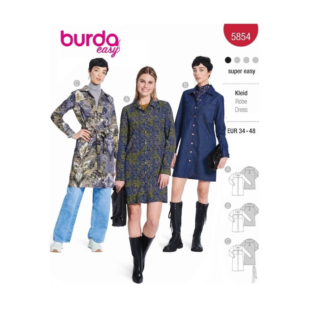 Strih Burda červený 5854 - košeľové šaty, džínsové šaty je súbor jednoduchých strihov na ušitie nových odevov pre Váš šatník