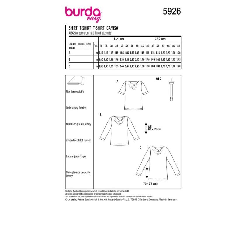 obchod@raj-sitia.skStrih Burda červený 5926 - tričko s vodou je súbor strihov na ušitie dámskeho trička s vodou vo výstrihu. Strihy sú vytlačené na kvalitnom kriedovom papieri. Vďaka jednoduchému strihu, podľa ktorého zvládnu šiť aj začiatočníci, získate originálne modely pre Váš šatník.