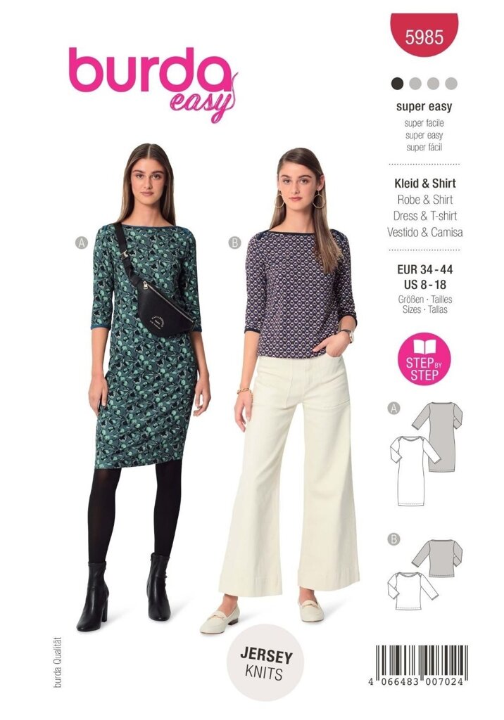 Strih Burda červený 5985 - tričkové šaty, tričko s lodičkovým výstrihom je súbor jednoduchých strihov na ušitie dámskych tričkových šiat a dámskeho trička s lodičkovým výstrihom.