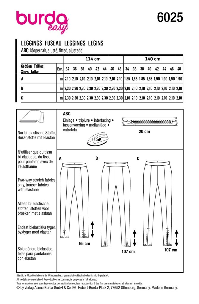 obchod@raj-sitia.skStrih Burda červený 6025 - legíny je súbor strihov na ušitie legín. Legíny má dnes v skrini každá žena. Nie je nad pohodlnosť legín a navyše sa legíny hodia na každú príležitosť. Strihy sú vytlačené na kvalitnom kriedovom papieri. Súbor obsahuje strihy na ušitie športových legín vo veľkostiach 34 - 48. Vďaka jednoduchému strihu, podľa ktorého zvládnu šiť aj začiatočníci, získate originálne oblečenie do Vášho šatníka.