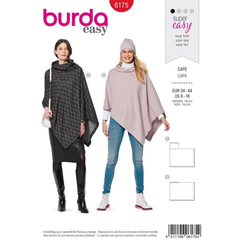 obchod@raj-sitia.skStrih Burda červený 6175 - dámske pončo, rolák je súbor strihov pre ušitie dámskeho ponča/roláka. Strihy sú vytlačené na kvalitnom kriedovom papieri. Súbor obsahuje strihy na ušitie dámskeho ponča/roláka. Vďaka jednoduchému strihu, podľa ktorého zvládnu šiť aj začiatočníci, získate originálne modely pre Váš šatník.
