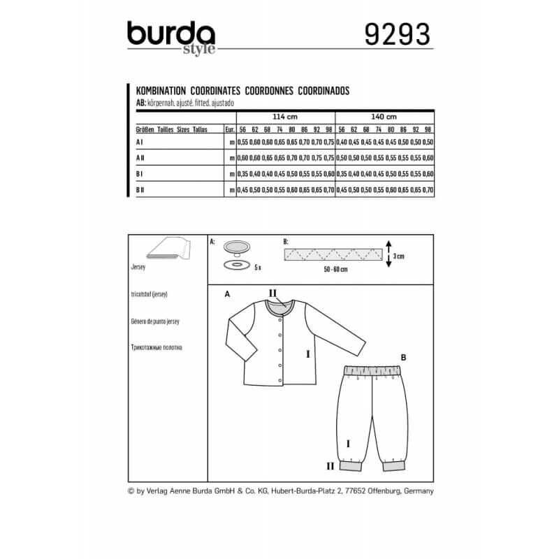 obchod@raj-sitia.skStrih Burda červený 9293 - detské tričko, nohavice s gumou v páse, je súbor strihov pre ušitie detského trička a nohavíc. Strihy sú vytlačené na kvalitnom kriedovom papieri. Súbor obsahuje strihy na ušitie detského zapínacieho trička s dlhým rukávom a nohavíc s gumou v páse. Vďaka jednoduchému strihu, podľa ktorého zvládnu šiť aj začiatočníci, získate originálne modely pre detský šatník.
